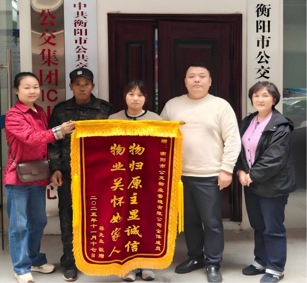 近日,市民蒋师傅携女儿专程来到衡阳市公交物业管理有限公司,将一面写有“物归原主显诚信 物业关怀如家人”的锦旗送至保洁员郭慧同志及物业公司负责人手中,以此感谢其拾金不昧、心系群众的真诚举动。