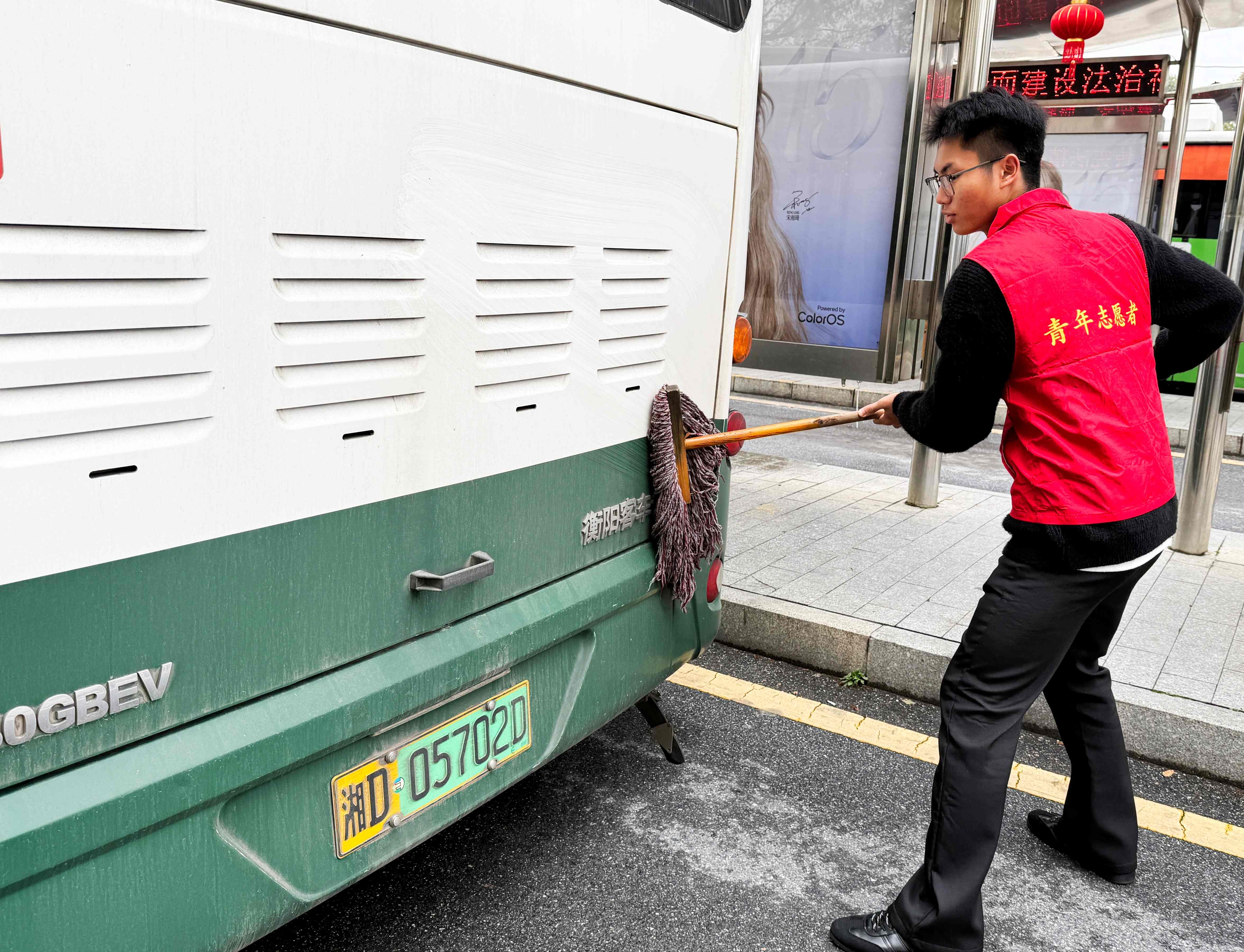 ▲志愿者擦拭着公交车上的灰尘污垢