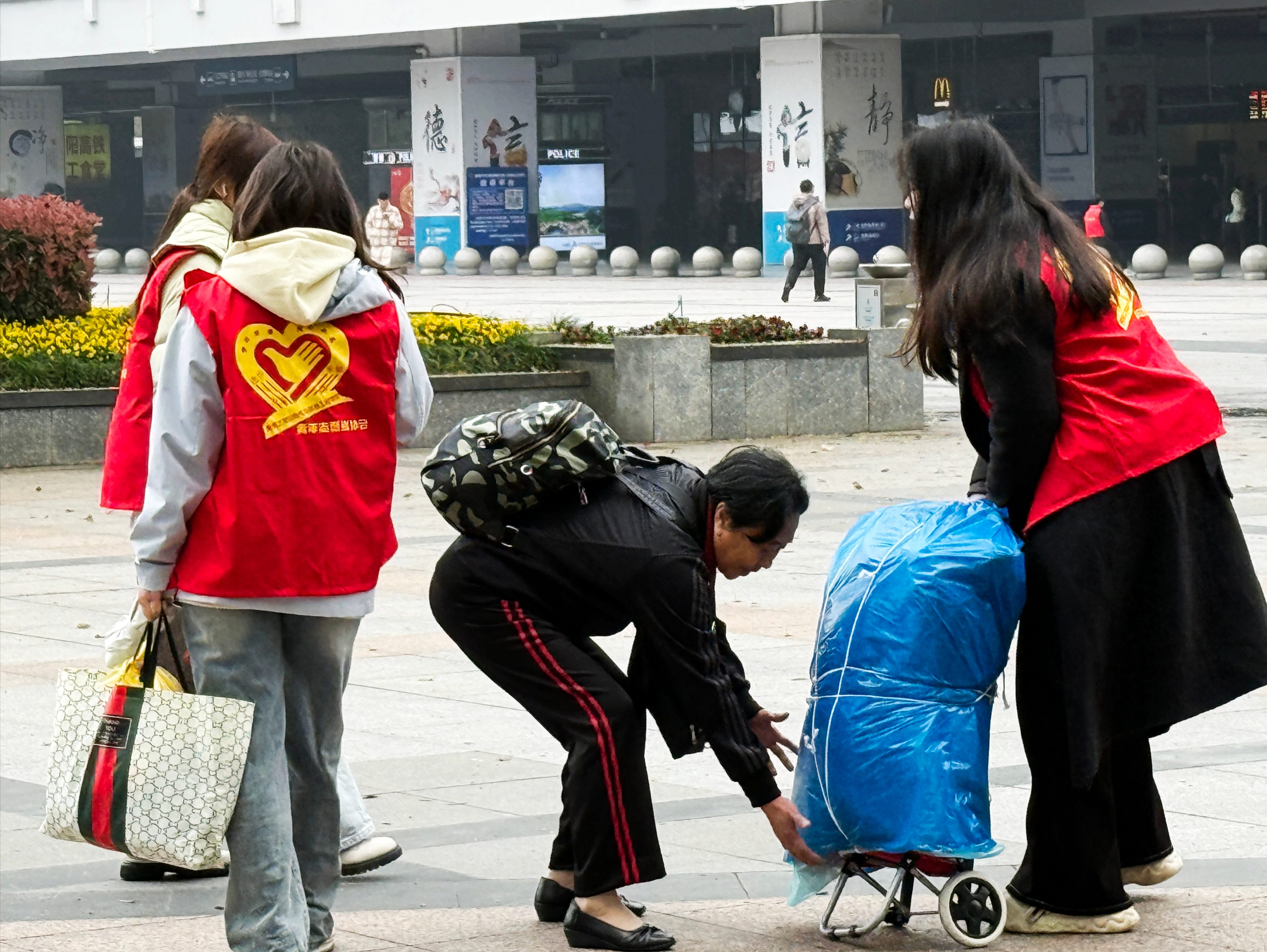▲志愿者帮助旅客提拿行李